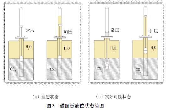 厂家提供的液位计磁性浮球不接触水时比重为1.12,介于压碳水1.0和二硫化碳1.26的比重之间,即比水重比二硫化碳轻。将此液位计在现场安装后进行试验,储罐液位控制在80%。常压状态时,人工测量为2.3m时液位计显示1.6m,浮子浮不起,二硫化碳界面呈虚低状态,如图3(a);加压状态时水位上升,人工测量为2.0m时液位计显示2.5m,出现浮子整体浮起,二硫化碳界面呈虚高状态,如图3(b),泄压时气体膨胀推动水位和浮球迅速下降,存在撞击底部的风险。