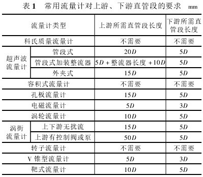 3)安装要求原则。流量计精度,受其前后直管段长度影响,选型时应结合管道专业的三维模型,按照前后直管段长度相关要求进行流量计的选择,常用流量计对.上游、下游直管段的要求如表1所示,其中D为流量计直径。