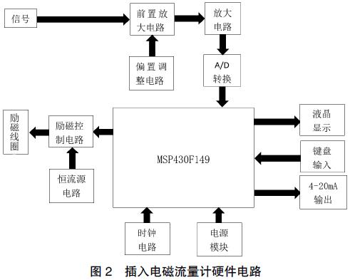 插入式电磁流量计整个硬件电路(图2)包括电源部分、励磁电路部分、信号放大采集处理部分及输入输出显示部分。其中影响流量计测量精度的主要是励磁电路部分和信号放大采集处理部分。