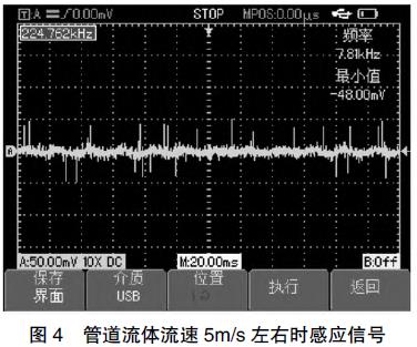 微分干扰和同相干扰会随着磁场的稳定而快速消失;共模干扰和串模干扰会造成插入式电磁流量计零点漂移,传输信号线采用屏蔽线,确保仪表接地良好可大幅度减弱其影响;电化学干扰主要是电极表面的极化现象会造成插入式电磁流量计零点不稳,提高励磁频率可以减小其影响。观察管道流体流速在5m/s左右时感应信号(图4),可以发现除去毛刺感应信号幅值可达25mV,但其中有用信号的幅值在0.5mV左右,所以信号放大采集过程中要进行滤波。参照励磁方式,分析流速信号电压的基本特征,以下从信号放大采集处理部分对流速信号能够有效地、针对性地放大、处理和滤除杂波进行分析。