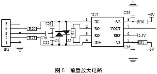 前置放大电路(图5)采用仪表放大器进行放大,仪表放大器前端是RFI滤波器,滤除衰减大部分干扰信号,