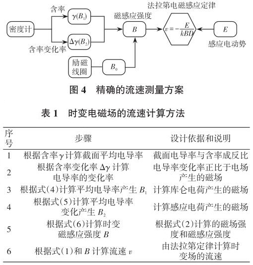 因此,利用射线源密度计或者船上的实际测量装置等测量出含率γ及其变化率Δγ,在线估计出瞬时流场中实际存在的时变磁感应强度B,并作为式(3)的输入变量。结合实际测得的感应电动势E,能够有效、准确地计算出时变的磁感应强度进而准确计算出瞬时流速,克服当前电磁流量计只能使用1个事先标定的先验磁场强度导致流速计算的误差。上述方法的实现步骤和实现过程如图4和表1所示。