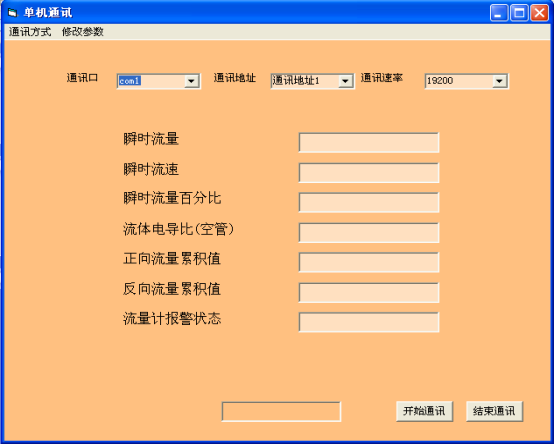 4、在软件上设置通讯口(有的计算机有两个串口,只有一个串口时设置为com1)、通讯地址和通讯速率使他与您在电磁流量计设置的相同,点击开始。