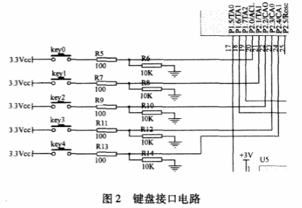 午夜成人小视频在使用时,需要根据不同管道直径、流体介质、温度、气压、黏滞系数等改变或修正相关参数,来计算体积流量或质量流量,所以仪表必须有可以现场修正的键盘。设计采用独立式键盘来修改相关参数值,键盘电路主要利用MSP430单片机的I0端口来进行设计。它的6组端口的每组8个IV0管脚可以单独设置成输人或者输出,且每个都可独立读写。如图2所示为键盘接口电路,,利用P2端口的每个管脚还可以单独设置为中断或只读口分别与P2.0~P2.4依次连接。按键功能分别是返回键、右移键、增1键、左移键、修改键。当修改键有按键动作时触发键盘中断,其它键按下不响应中断。当进人中断后按下其它任意键使得对应,P2口由100Q和1kn两个电阻对3.3V分压为高电平3V,弹起键时对应P2口为低电平0,以此作为键盘扫描判断。