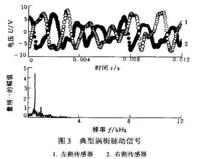 进行强度比较之前,需要对涡街的信号特点进行分析并定出可以度量强度的量。如图3涡街信号是周期性的但其波动的幅值不等,故涡街的强度需要从统计.上进行比较。试验中制定的涡街强度的统计量为.