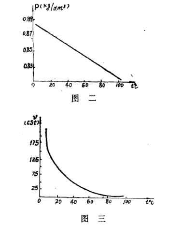 30#机油的ρ(密度)一t℃(温度)及v(运动学粘度)-t℃的曲线分别见图二、图三。