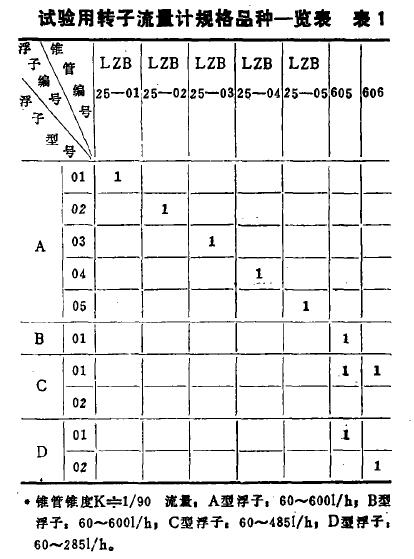 试验用转子流量计的规格品种见表1。