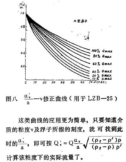 这类修正曲线的纵座标是以流量Q来表;示的(锥管.上的刻度流量),整个曲线的描绘是按锥管上的刻度流量(或浮子的位置)来区分的,也即一个刻度值有一条修正曲线。应该注意的是,在描述粘性介质的流量时,将粘性介质的流量进行密度修正后,才能描述在曲线图上。