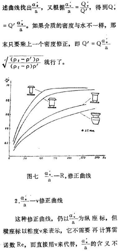该种修正曲线,即以粘性流体的流量系数α´;与理想流体(没有粘性的流体,可用水来代替,以下均用水作为理想流体,不再另作说明)的流量系数α之比作为纵座标,而以雷诺数Re作为横座标来描绘的。
