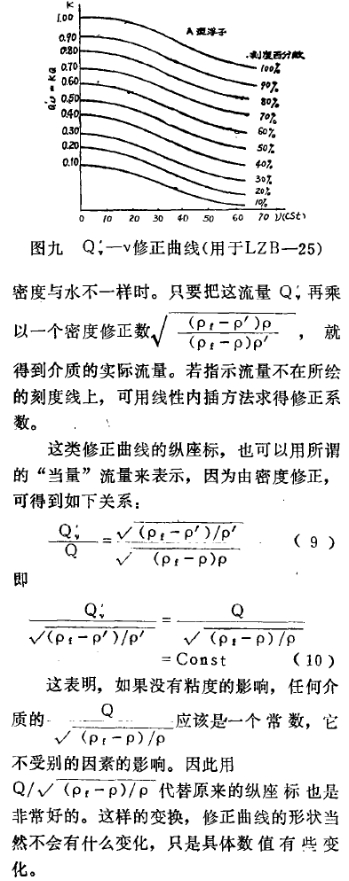 如果粘性介,质的密度与水是一样的,那就无需进行密度修正,可以将得到的流量直接描绘在曲线图上。此类修正曲线见图九。