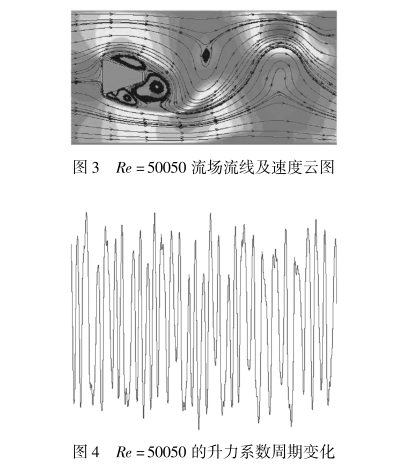 通过流场后处理软件Tecplot对其进行分析,可以显示午夜成人小视频数值仿真的流场信息,可以观测到漩涡的脱落状态分布以及流线速度特征,漩涡的脱落导致午夜成人小视频漩涡发生体表面的压力分布和升/阻力系数的周期变化。图3给出的是午夜成人小视频管道流量为640m3/h,Re为50050的流场流线分布及管向速度云图;图4给出的是升力系数在格子时间尺度下的周期变化。午夜成人小视频仪表的检定过程中,关注的主要是仪表系数,其正比于仪表脉冲系数(或漩涡脱落频率),反比于仪表流量。于是,本文数值仿真关注的主要是午夜成人小视频的漩涡脱落频率,该频率与涡街漩涡发生体的升力系数变化周期相关,可以通过对升力系数变化信息的分析得到漩涡脱落频率。由于本文是基于LBM的数值模拟,,仿真结果也是立足于格子尺度,漩涡脱落频率要经过当地格子时间比例因子1,的变换获得。利用Matlab傅里叶变换对升力系数变化周期进行频域变换分析,可以得到午夜成人小视频漩涡发生体的漩涡脱落周期,经过比例因子l,的转换获得当地漩涡脱落周期,进而求得当地漩涡脱落频率。