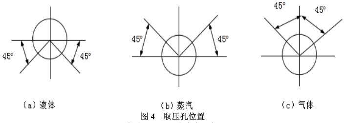 1. 取压孔角度。测量介质为气体时,取压孔设在管道上半部,与管道垂直中心线成0°~45°夹角,可以避免引压管积液;测量介质为液体时,开孔在管道下半部,与水平中心线成0°~45°夹角;测量介质为蒸汽时,开孔在管道上半部,与管道水平中心线成0°~45°夹角,如图4所示。