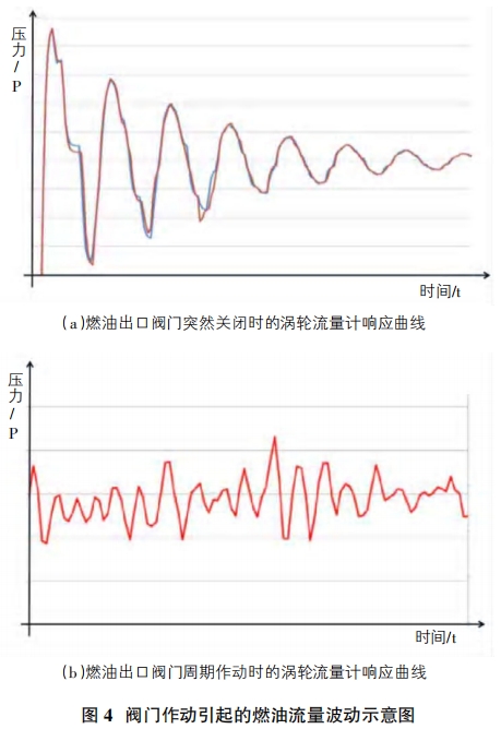 脉动流指流体在测量区域的流速是时间的函数,但在一个足够长的时间段内有一个相对稳定的平均值。脉动流-般由齿轮泵、离心泵、压力调节阀、电液伺服阀、电磁阀等的作动产生。脉动流产生的来源有多种,可来源于往复旋转的机械部件,如燃油增压泵;可来源于管道或支架振动,如系统共振或支架颤振;可来源于压力调节阀或流量控制阀的快速的压力或流量调节;也可来源于流体管道阀门、节流喷嘴的周期性作动;还可来源于系统节流孔板、弯头等几何特征而引起的流体振动和湍流。如图4燃油出口阀门作动引起的脉动流。