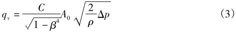 式中:qv为体积流量;C为修正系数;β为流量计的直径比;A0为流道横截面积;Δp为流道出口与入口处的压差;ρ为流体密度。