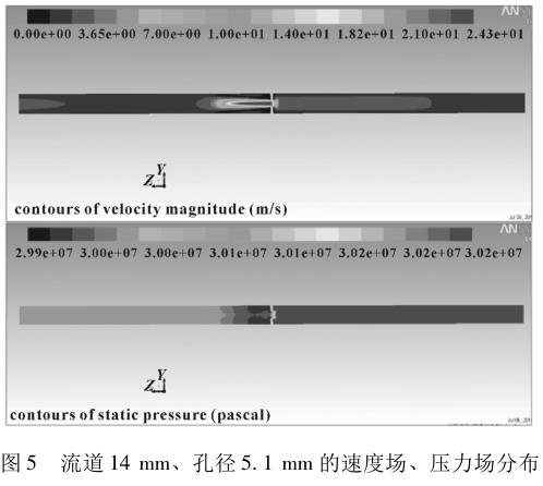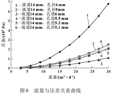 运用FLUENT软件与成人午夜免费视频流量-压差计算公式(3),对量程为3~30m3/d的流量计对应的流道结构进行数值模拟,绘制的流量与压差关系曲线如图5—6所示。孔板两端最高压差为0.2MPa时,对应流量计的流道尺寸为:流道直径14mm,孔板直径5.1mm。