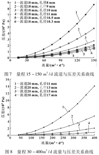在3~30m3/d流量计设计成功的基础上,利用FLUENT软件对量程分别为15~150m3/d、30~400m3/d的流量计对应流道进行了模拟,绘制流量与压差关系曲线如图7—8所示。