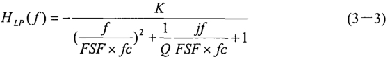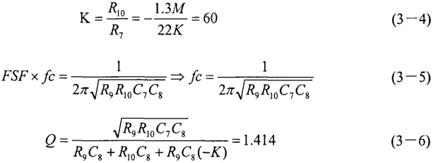 式中:f为频率变量,fc是截止频率,FSF是频率比例因子,Q是品质因数.在本电路中,如图3-4,R7=R8=22KΩ,FSF=l,Q=1.414,则: