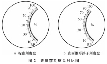 将标定结果数据制作成刻度盘,如图2b所示,刻度中长线对应的是11个流量点,与图2a所示的标准刻度盘进行对比可知,前40%流量跨度比较大,分布比较疏散,后40%流量跨度小,分布比较集中,视觉效果差。同时测量精度也差,例如90%到100%只有两个刻度格,因流量变化点相距太近,可能93%到97%范围间的流量都指示在95%的位置。其他口径和流量段的分布情况均类似。