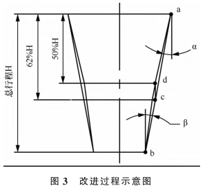即将c点移动到d点,由a、b、d三点确认圆弧。由表1数据可知,流量点10%~80%位置点均同50%处一样偏高,通过新确认的圆弧,可将10%~80%位置点均向下进行调整,即对应图3所有的半径点均上移。图2中前40%的流量跨度大,说明倾斜角α较小,新确认的圆弧增加了倾斜角α的角度值;后40%的流量跨度小,说明倾斜角β较大,新确认的圆弧降低了倾斜角β的角度值。