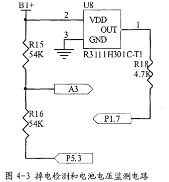 使用RleoN公司生产的Lvn(LowvoltageDetector)R3111x系列中的一款R3111H301C-Tl对电池电压进行实时监测。该芯片在0.7V~I0V电压范围内能保持正常工作。当电池电压降到其复位门限电压3.0v以下时,R31llH30lC的OUT脚产生负跳变,单片机PI.7管脚被配置为外部中断入口,下降沿有效,当发现负跳变电平后,立即进入中断服务程序,将重要参数和累计流量保存到外扩的铁电存储器FRAM中,同时将中断触发条件改为上升沿,系统转入低功耗模式3(LPM3),此时关闭所有外设,仅保持低速时钟和中断有效,LPM3模式的功耗不到2μA。当系统电源电压重新恢复正常并且没有引起系统复位时,R3111H301C的OUT脚产生正跳变,在中断服务程序中退出LPM3模式,恢复数据和程序运行。如果不是电源电压波动,而是用户摘掉电池或是切换电源,被监测电压会低至引起系统复位,可在程序开始时恢复数据。系统掉电后,会有两个大电容为系统放电一段时间,支持掉电中断服务程序完成。R3111H301C耗电极低,仅有0.8林A,非常适合对电池电压连续实时监测。系统供电正常,R311IH3OIC输出高电平,如果单片机Pl.7管脚未初始化为输入状态而是设置为输出低电平,会拉低R3111H301C的输出电平,不仅会烧坏R31llH301C,而且单片机PI.7过流保护二极管也会热损坏,所以在二者之间增加了限流电阻R18,起到一定的保护作用。